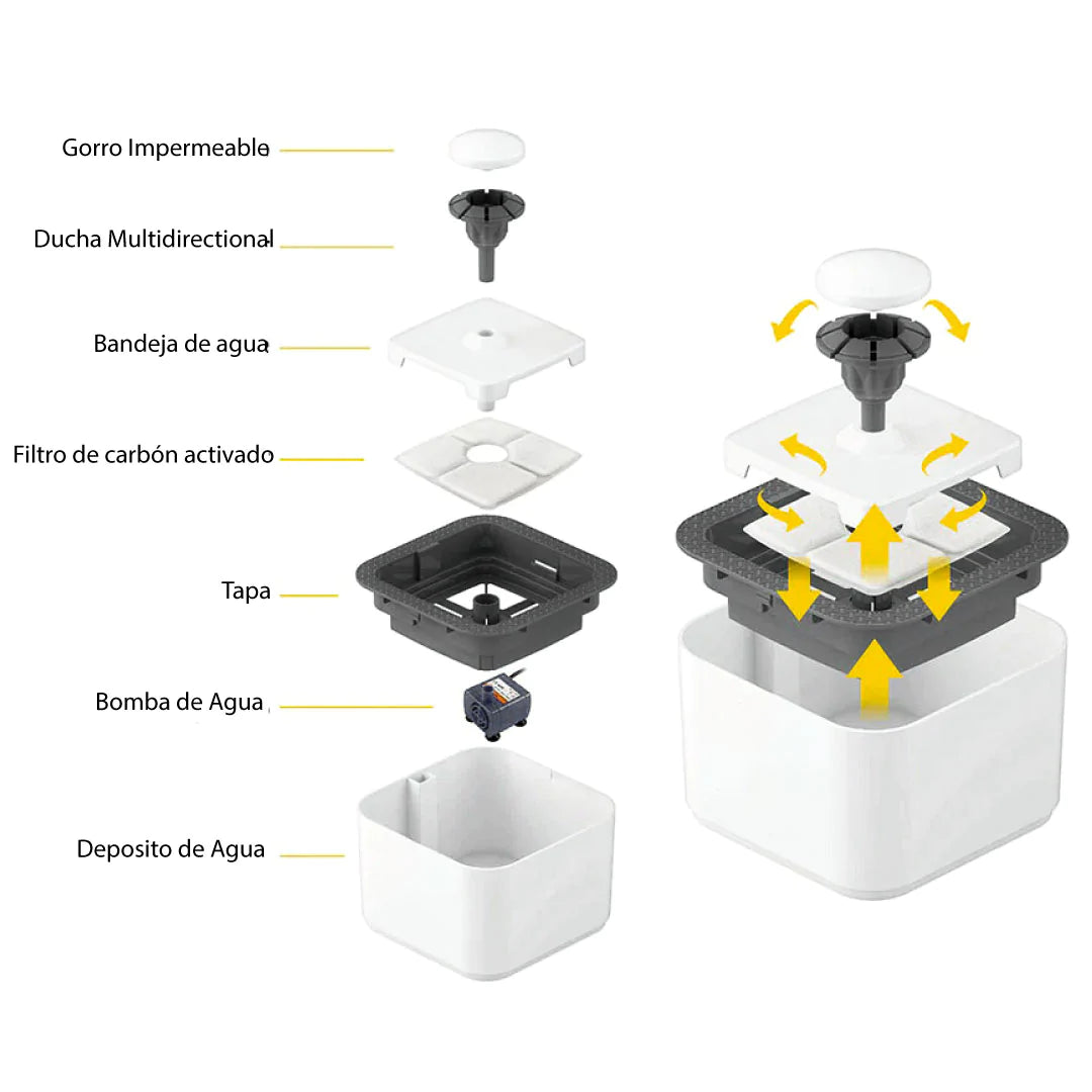 Capacidad de agua de 2,5 L: Puede contener 2,5 litros de agua y un flujo de agua constante, esta fuente mantendrá a su gato o perro feliz e hidratado.Flujo de agua: el agua fluye circularmente, más interesante para su mascota que el agua sin gas que cae en un tazón de agua ordinario, atrayéndola a beber más.Triple Filtración: la fuente de agua para gatos tiene un sistema de triple filtración con un algodón, elimina el exceso de impurezas, escombros y olores del agua.Bomba mejorada: con una bomba de agua silenciosa incorporada, bajo consumo de energía, ahorro de energía, impermeable IPX8. Sugerimos limpiar la bomba al menos cada dos semanas.Material: hecho de plástico PP ecológico, duradero y fácil de limpiar, que también inhibe el crecimiento de gérmenes, proporciona a su gato agua filtrada de flujo fresco.